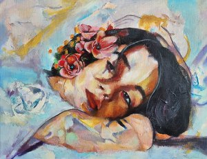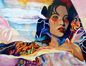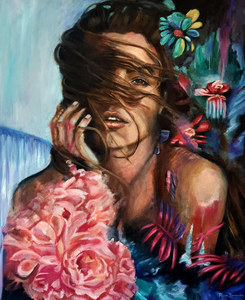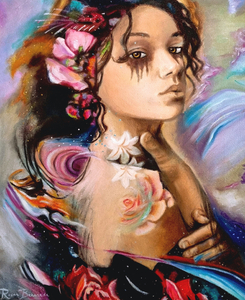 2021In dit intieme meesterwerk staat een veerkrachtige vrouw centraal, omringd door een dynamische wereld van beweging. Versierd met abstracte bloemen in haar haar straalt de vrouw kracht uit, met haar kin hoog opgeheven. Haar blik is zelfverzekerd, een weerspiegeling van vastberadenheid om de uitdagingen om haar heen aan te gaan. Toch onthullen sporen van make-up onder haar ogen een diepere waarheid: een glimp van de kwetsbaarheid die naast haar kracht bestaat.