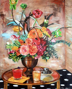 2019Verken de betoverende wereld van 'Flower Power', een fascinerend olieverfschilderij. Dit canvas van 50 x 60 cm is een viering van de schoonheid van het leven, afgebeeld door een levendige vaas met bloemen, een verleidelijke cocktail en het warme schijnsel van een kaars op een tafel tegen de achtergrond van een stenen muur en zwart-witte tegels. Laat de kleuren je inspireren en dompel jezelf onder in de diepe schoonheid die ons omringt.